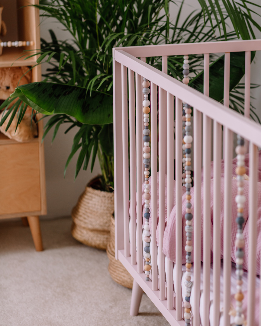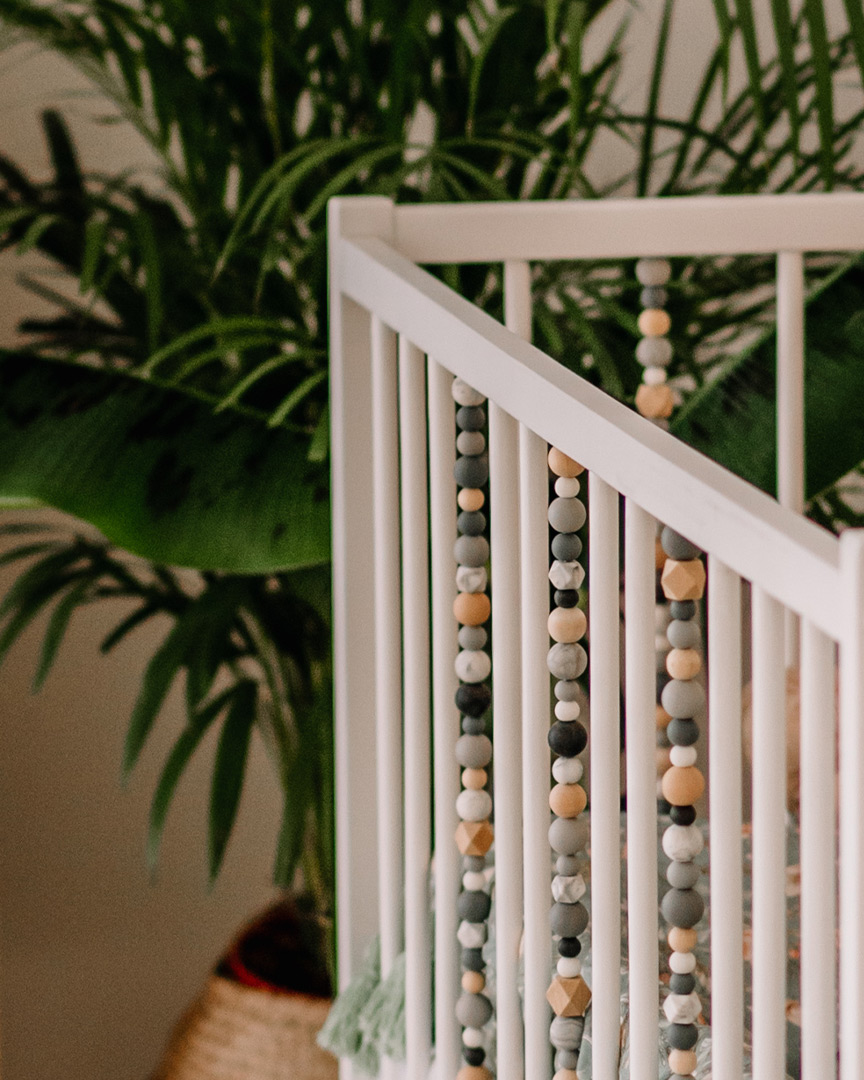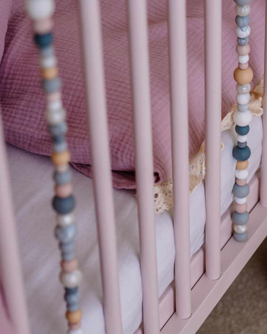 Das Bett ist mit einem Set aus hölzernen und silikonenen Sinnesperlen verziert, die die Entwicklung des Kindes durch die Stimulation von Tastsinn und Sehen fördern. Es ist die perfekte Ergänzung für Mädchen- und Jungenzimmer, insbesondere in Kombination mit anderen Domo Kids-Sinnesmöbeln wie der Kommode und dem Regal, um ein stimmiges Kinderzimmerdesign zu schaffen.