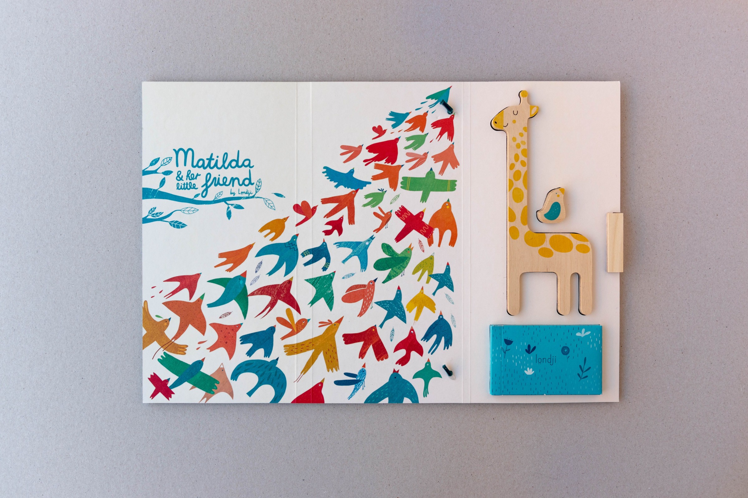 Matilda die Giraffe hilft dem kleinen Vogel, sein Nest zu bauen.