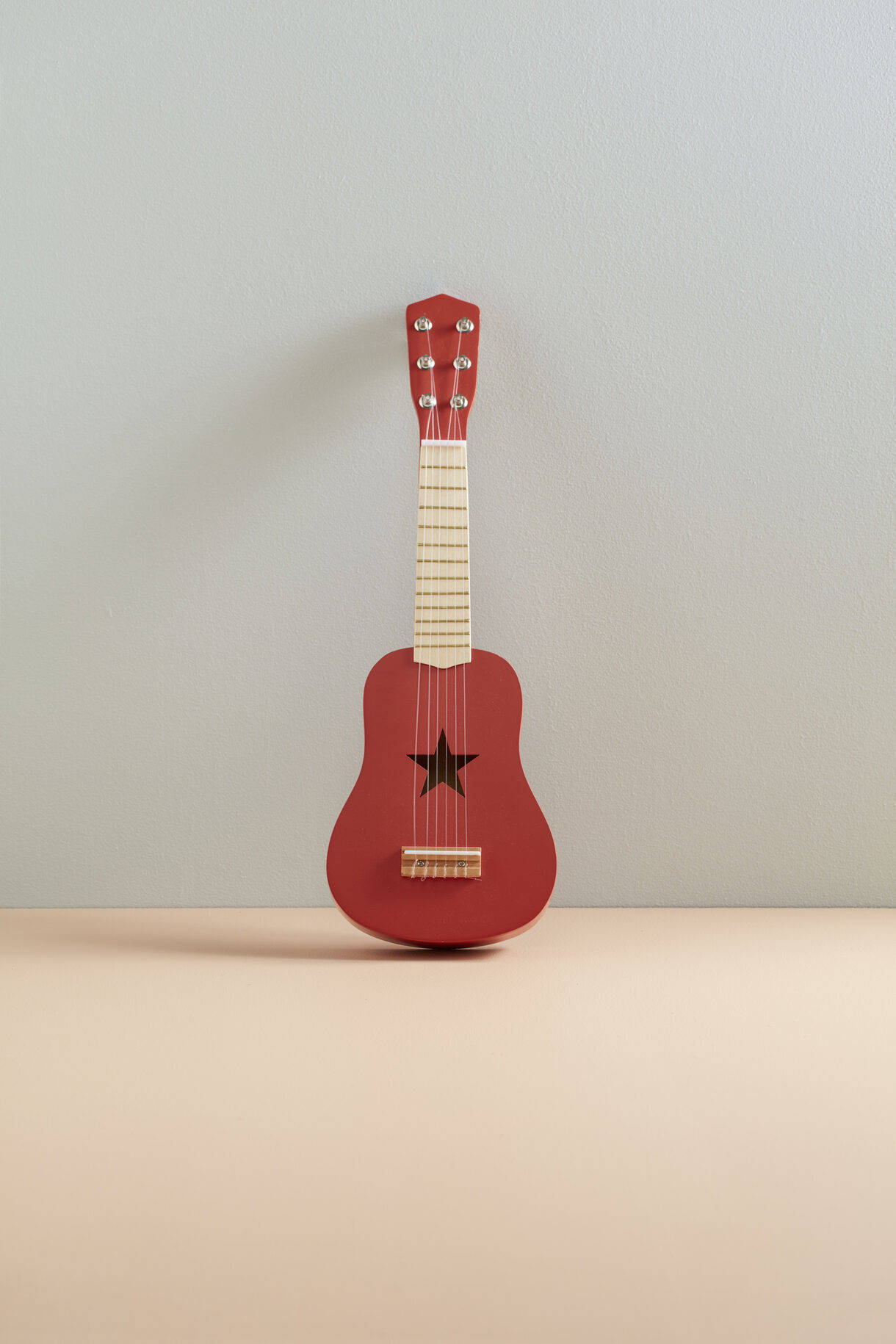 Holzspielzeuggitarre mit Sternausschnitt. Kinder lieben es, Instrumente zu spielen und selbst Geräusche zu erzeugen. Diese Gitarre ist auch ein schönes Einrichtungselement für das Kinderzimmer oder überall im Haus, um ihr einen Farbtupfer anstelle eines Kissens oder Bildes zu verleihen. Die Saiten können wie bei einer normalen Gitarre gedehnt werden. Perfekt als Spielzeug für Kinder, die Musik lieben oder um ihr Interesse an Musik zu wecken. Warum nicht eine Rockband für Kinder gründen?