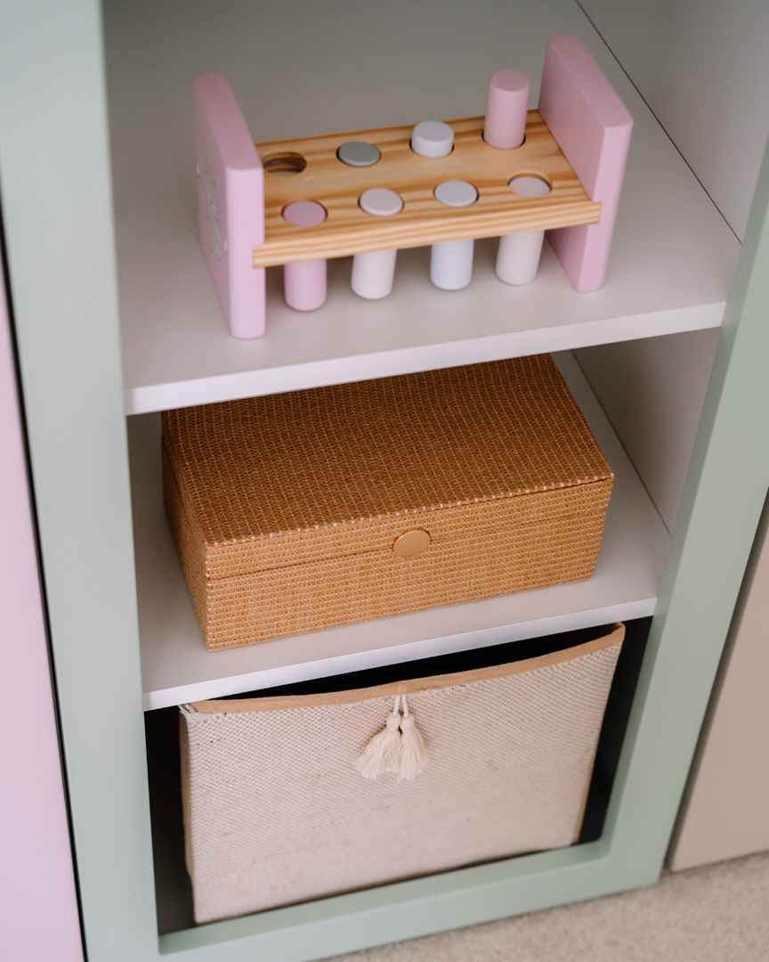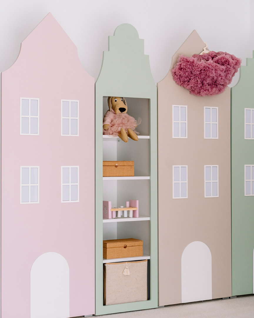 Das Regal in Hausform kann einzeln verwendet werden oder, in Kombination mit den Domo Kids Schränken, eine magische Straße im Kinderzimmer erschaffen. Die Schränke und Regale sind in vier Designs und fünf Pastellfarben erhältlich und zusammen mit dem Hausbett ermöglichen sie eine stimmige Zimmergestaltung.